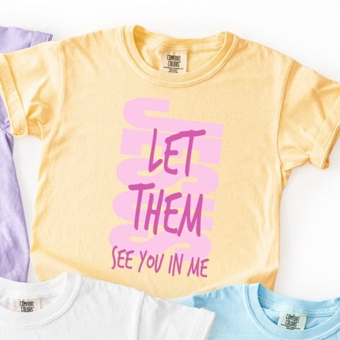 Faith meets color in this bold, joy-filled tee! Featuring the powerful phrase “Let Them See You in Me” in bright, eye-catching colors—this shirt is a daily reminder to reflect Jesus in everything you do.