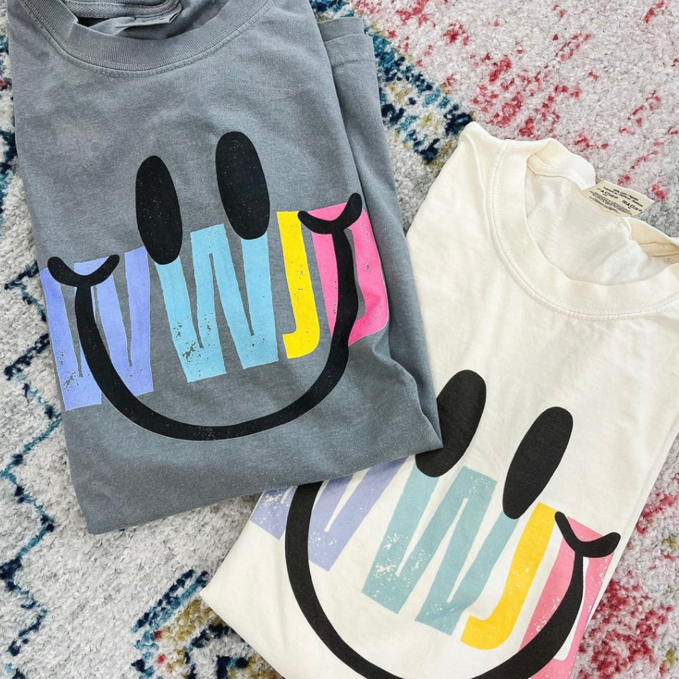 Bold faith meets feel-good vibes! This colorful WWJD tee features bright multicolor letters with a big happy smile on top—because asking What Would Jesus Do? should bring joy.